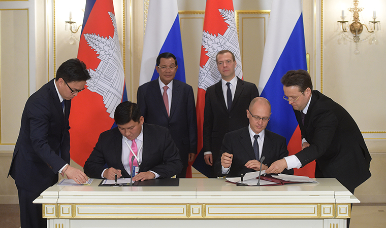 back to contentsRussia’s state-run nuclear corporation Rosatom will set up an information center in the Kingdom of Cambodia, says a memorandum published in mid-May. Along with the center, the parties will establish a working group on peaceful uses of nuclear power. Relevant documents were signed by Rosatom CEO Sergei Kirienko and Say Samal, Cambodia’s Minister of Environment and Chairman of the National Council for Sustainable Development. Russia’s Prime Minister Dmitri Medvedev and Hun Sen, Prime Minister of Cambodia, were present at the signing ceremony.