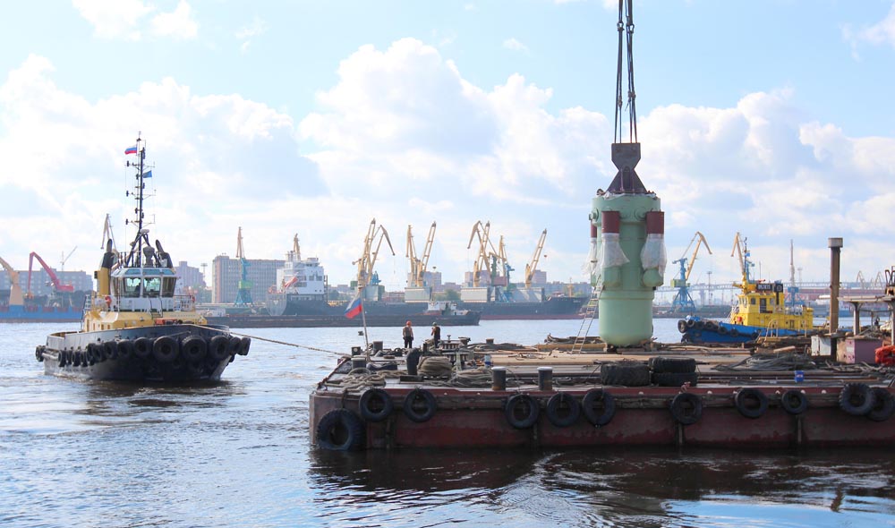 back to contentsInstallation of a propulsion unit is a key operation in the construction of a nuclear icebreaker. The first of the two steam generators of the RITM-200 propulsion unit has already been mounted in its permanent position on the Artktika icebreaker. The generator weighing around 180 tons was loaded onto the vessel with a Demag floating crane. The other steam generator is to be mounted within a month.
