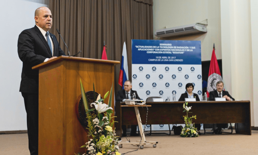 In his speech, the Minister Cardozo Román expressed his gratitude to the organizers and all antendees, many of them students from UNA, besides offering a brief nuclear background, as well as brief panorama on the current situation of Paraguayan nuclear industry. He highlighted that application of nuclear technologies in medicine and agricultural business becomes highly required. “Nowadays we depend on our neighboring countries in radiotherapy diagnostics and treatment. The growing demand of such services cannot be fulfilled in Paraguay so we are very interested in modern solutions that nuclear technologies provide. As our country is one of the centers of tourism medicine, these solutions can increase variability of services we provide and even attract patients from other countries to get treatment here”, he stated. Cardozo Román also noticed that Paraguay faces limitations in products exports thanks to the global exigency for safe products. “We have a great export potential of products derived from the agro, but today, we can’t consider market of European countries or the United States, because following strict safety regulations they require irradiation to be executed before entering products. So the calling for applications of nuclear technologies is made by business reasons”, he added.