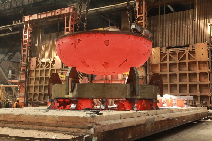 The resulting 300 mm thick plate weighed 64 metric tons. At the second stage, the plate was heated at 1,070°C for six hours. Then, the red-hot plate was put into a press with a special die set. The required shape was obtained by stamping the plate with a force of 12,000 metric tons.