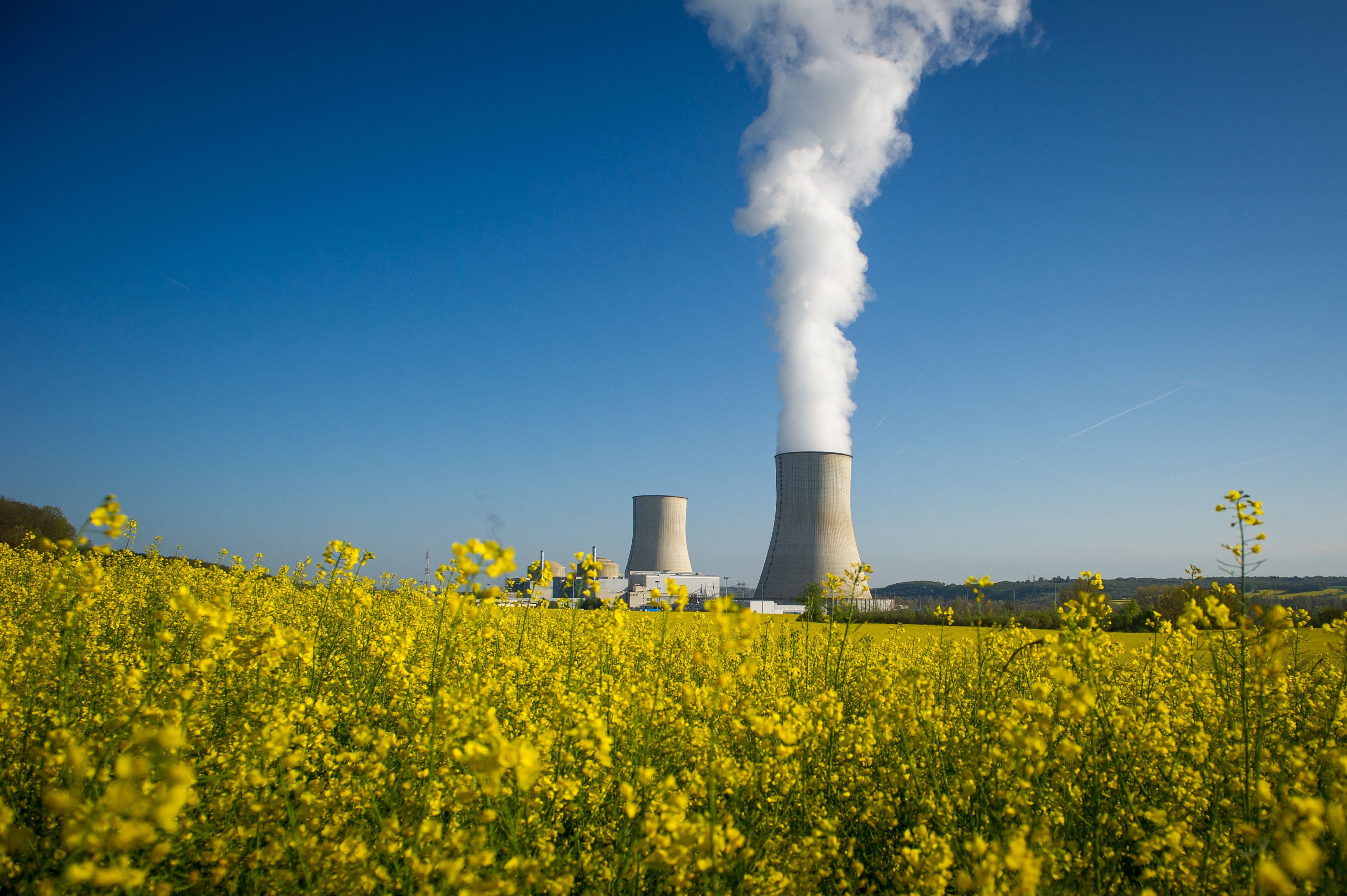 A picture taken on April 25, 2016, shows the two cooling towers of the nuclear power plant of Civaux, seen behind a colza field, in Civaux, central France. / AFP / GUILLAUME SOUVANT (Photo credit should read GUILLAUME SOUVANT/AFP/Getty Images)