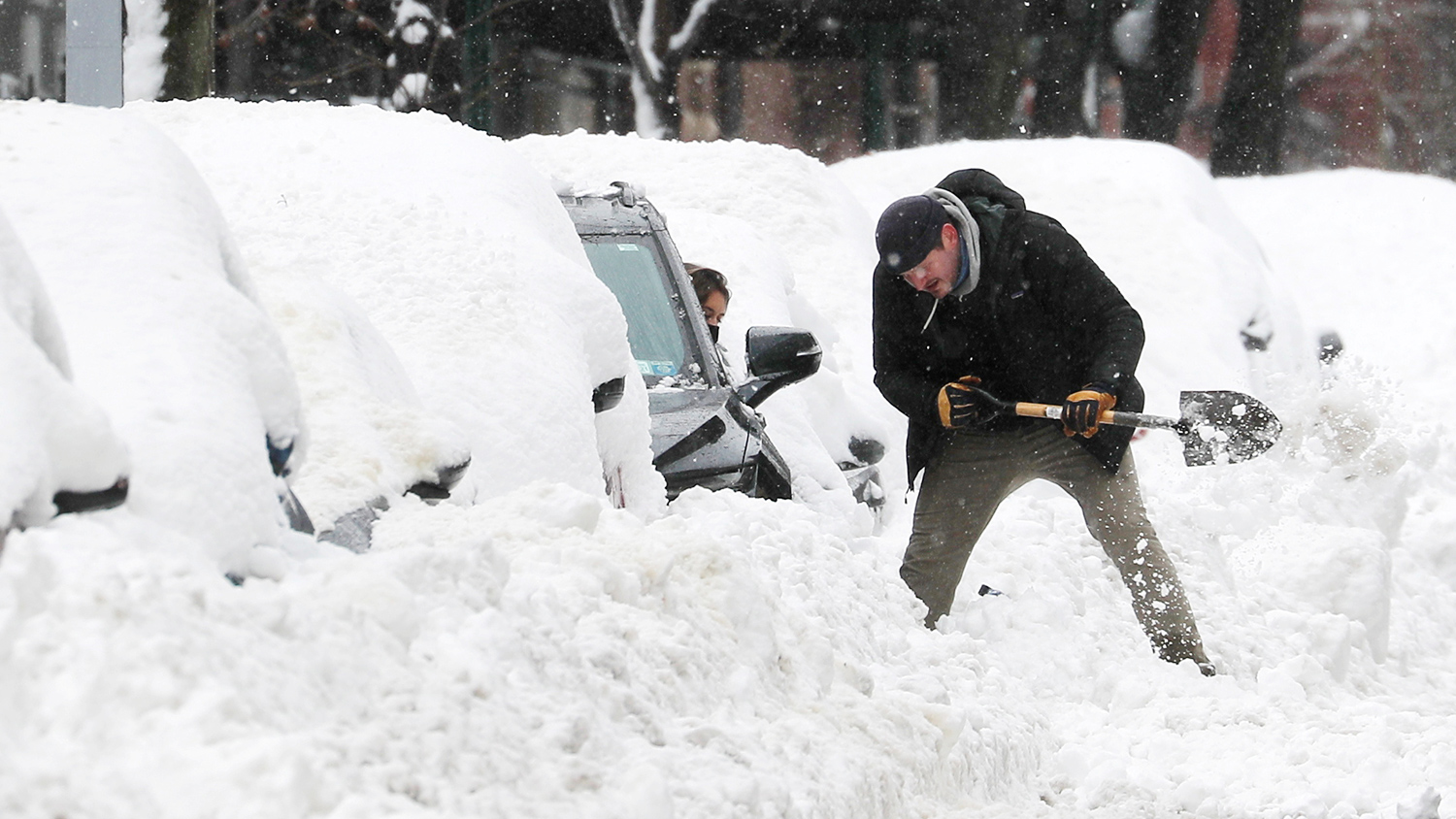FILE PHOTO: A man helps a driver dig her car out from deep snow on Manhattan’s upper west side after a winter storm in New York City, New York, U.S., February 2, 2021. REUTERS/Mike Segar/File Photo