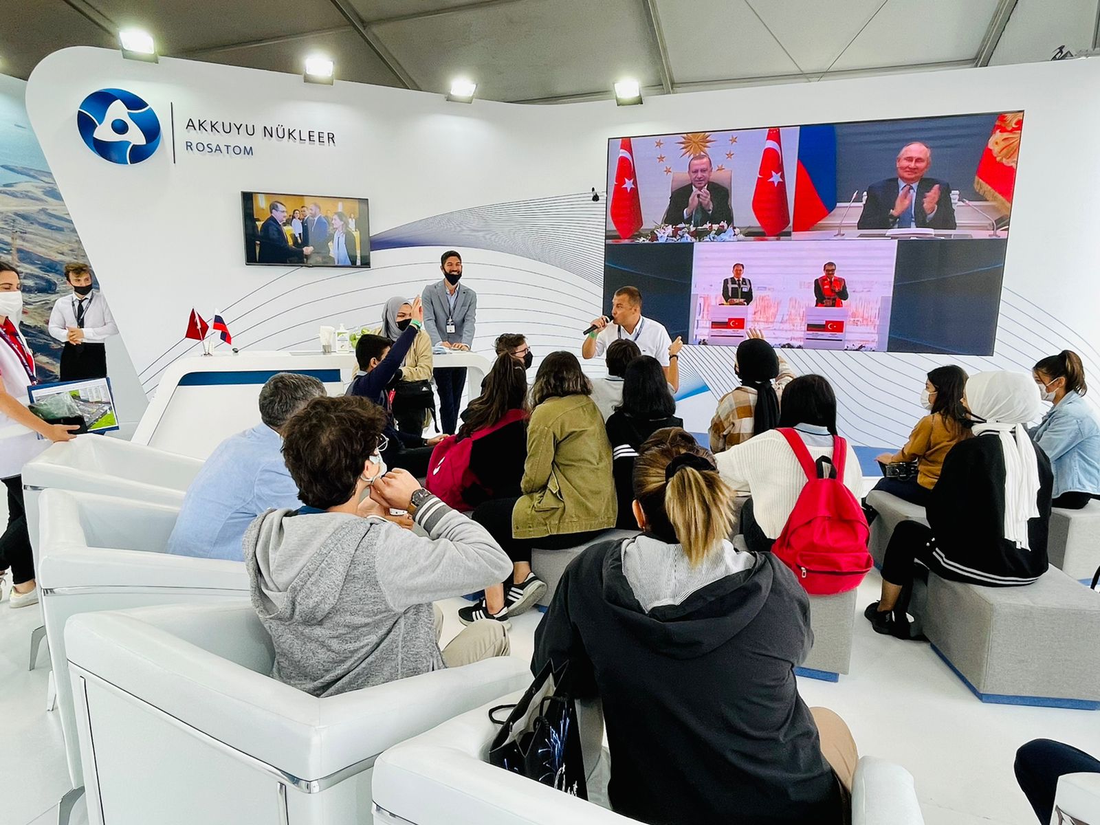 The screening of episodes from the Atoms for Humanity documentary series attracted a lot of attention. The film is an educational project initiated by Rosatom to demonstrate the significance of nuclear technology for achieving the UN Sustainable Development Goals. By presenting personal stories, the project highlights the importance of nuclear technology for the development of cities and regions and changing people’s lives for the better. The visitors of AKKUYU NUCLEAR’s booth had a chance to watch the Turkish episode of the documentary series and talk to their protagonists, Burak and Canan Alatli, a young couple who studied in Russia under the Akkuyu NPP personnel training program and working at the construction site of Turkey’s first nuclear power plant.