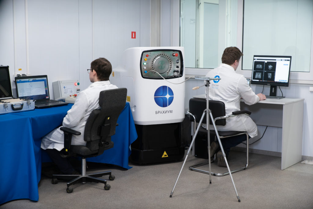 O equipamento Brachium recebeu um certificado de registro no final de dezembro do ano passado. Consiste em uma unidade de terapia gama que usa o método de radioterapia por contato. O princípio de funcionamento é o seguinte: uma fonte de radiação ionizante é aplicada ao tumor (o equipamento é fornecido juntamente com o aplicador especial). Devido à alta precisão de posicionamento com um passo de apenas 1 mm, a fonte atua no tecido doente e afeta minimamente o tecido saudável. O Brachium é usado para tratar tumores na nasofaringe e cavidade oral, esôfago, brônquios e pulmões, mama e próstata. A segurança do pessoal também foi considerada: uma blindagem de tungstênio no dispositivo, onde a fonte de radiação é armazenada após o tratamento, protege contra a radiação ionizante. O software com base em inteligência artificial permitirá ao médico planejar um programa de tratamento individual, calcular com precisão a dose, manter estatísticas e rastrear a dinâmica. A Rusatom Healthcare já vendeu seu primeiro lote de Brachiums.