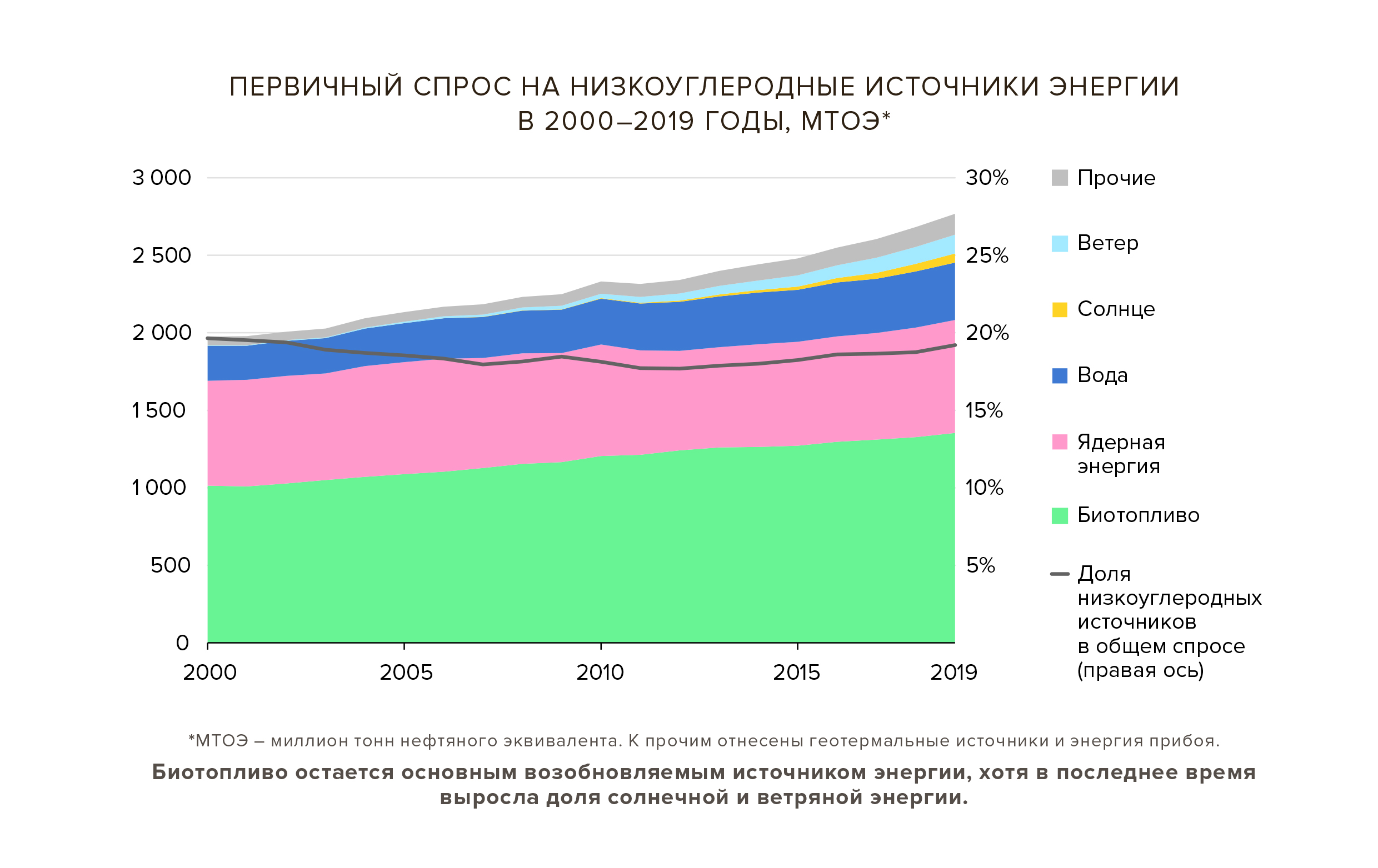 В число низкоуглеродных авторы исследования включили энергию, получаемую из биомассы, в которую примерно в равных пропорциях включены как традиционная биомасса (дрова, древесный уголь и иные производные деревоперерабатывающей промышленности), так и новые источники биоэнергии. По мысли авторов отчета, электричество, водород, синтетическое топливо, а также энергия из биомассы должны занять тот объем спроса, который сейчас удовлетворяется за счет использования угля, нефти и природного газа.