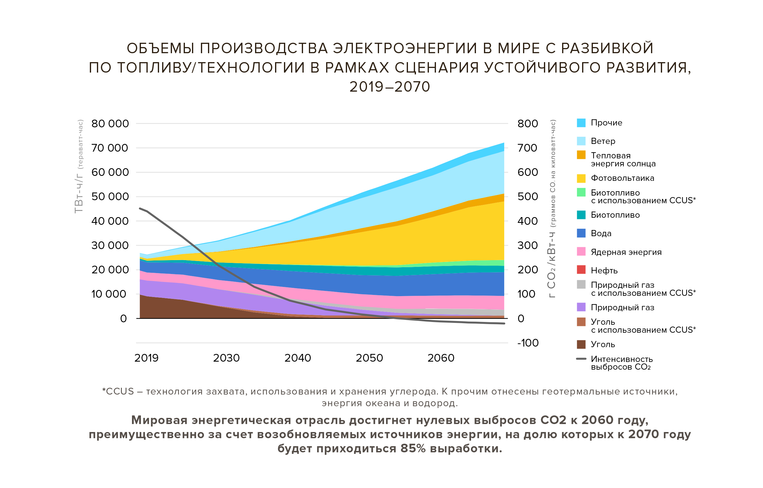 В целом, в соответствии со сценарием устойчивого развития спрос на электроэнергию более чем удвоится. «Рост спроса будет обусловлен выработкой электричества для зарядки легковых и грузовых автомобилей и автобусов, переработкой лома металлов, производством тепла для нужд промышленности, а также использованием электроэнергии для обогрева, приготовления пищи и работы бытовых приборов». А производство электроэнергии — утроится к 2070 году, отмечается в исследовании.