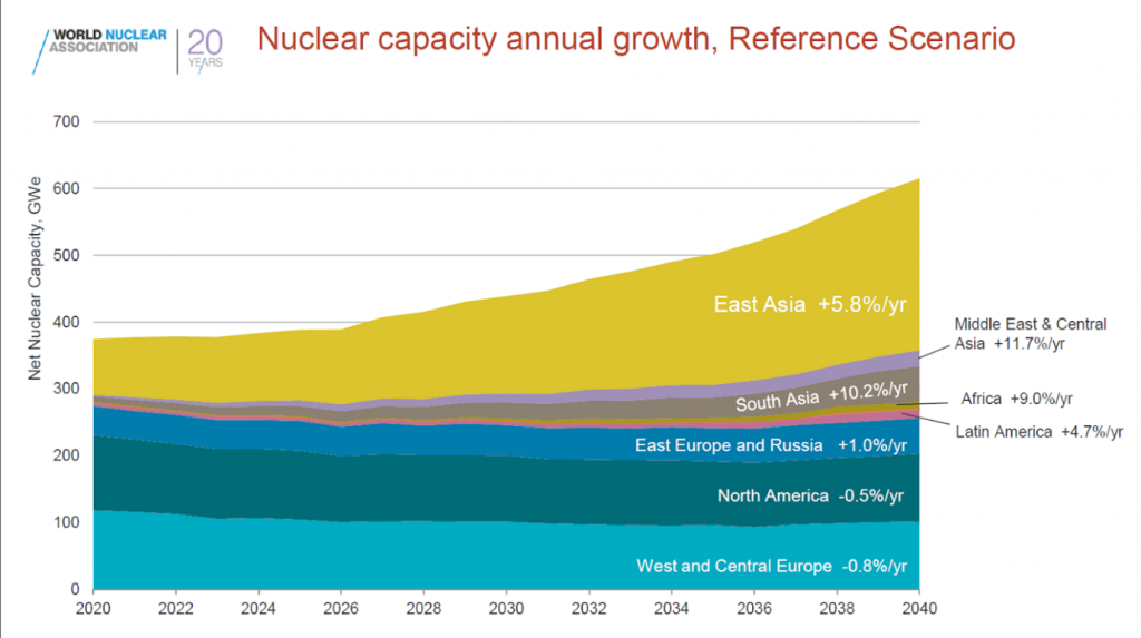 Dünya Nükleer Birliği de üç senaryo geliştirdi ancak nükleer yakıt döngüsü merceğinden baktı. Eylül ayı başlarında, WNA, sempozyumda Yakıt Raporu Çalışma Grubu’nun iki eş başkanı, Exelon’dan James Nevling ve TENEX’in Birinci Başkan Yardımcısı Danışmanı Alexander Boytsov tarafından sunulan düzenli Nükleer Yakıt Raporunu yayınladı. Rapora imza atanlara göre 2013, 2015 ve 2017 raporlarında bahsedilen olumsuz eğilim nihayet tersine döndü. Raporda, “Referans ve Üst senaryolarda yakın ve orta vadede görülebilecek nükleer üretim kapasitesi projeksiyonlarında hafif bir düşüşe rağmen, her üç vaka da Doğu ve Güney Asya’daki geniş nükleer inşaat programları, uzatılmış işletme ömürleri nedeniyle 2035’ten itibaren önemli bir büyüme göstermektedir. 2040’tan önce ilk reaktörlerini işletmesi beklenen yeni gelen ülkeler nedeniyle mevcut reaktörlerin sayısı ve nükleer ülke havuzunun genişlemesi bekleniyor” ifadeleri yer alıyor.